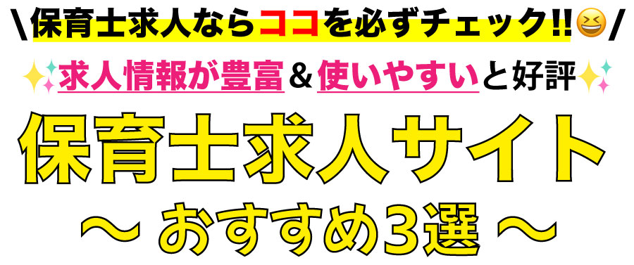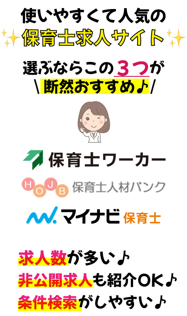 そこで、当サイトが人気の高い保育士求人サイトを徹底調査!その結果、本当におすすめできる求人サイトを3種類ピックアップしたので、ぜひ参考にしてみてください♪